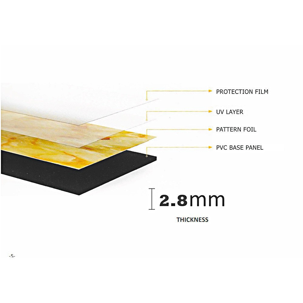 1 plate covers an area of 3 square meters. It can be laminated to betopan and MDF materials. It is waterproof and has high moisture resistance. It has a shiny surface with UV layer. Class B1 does not contain flames and does not emit toxic smoke. It is light and easy to clean and maintain.
