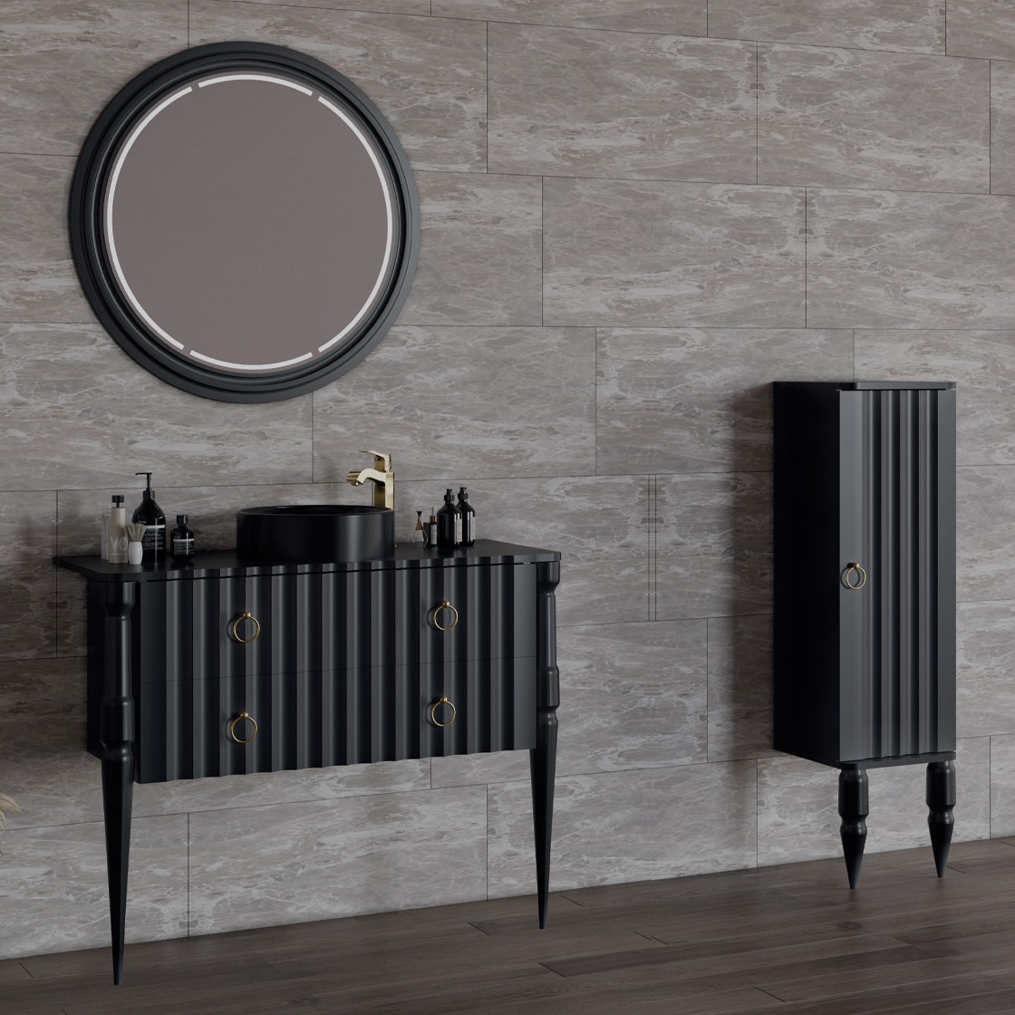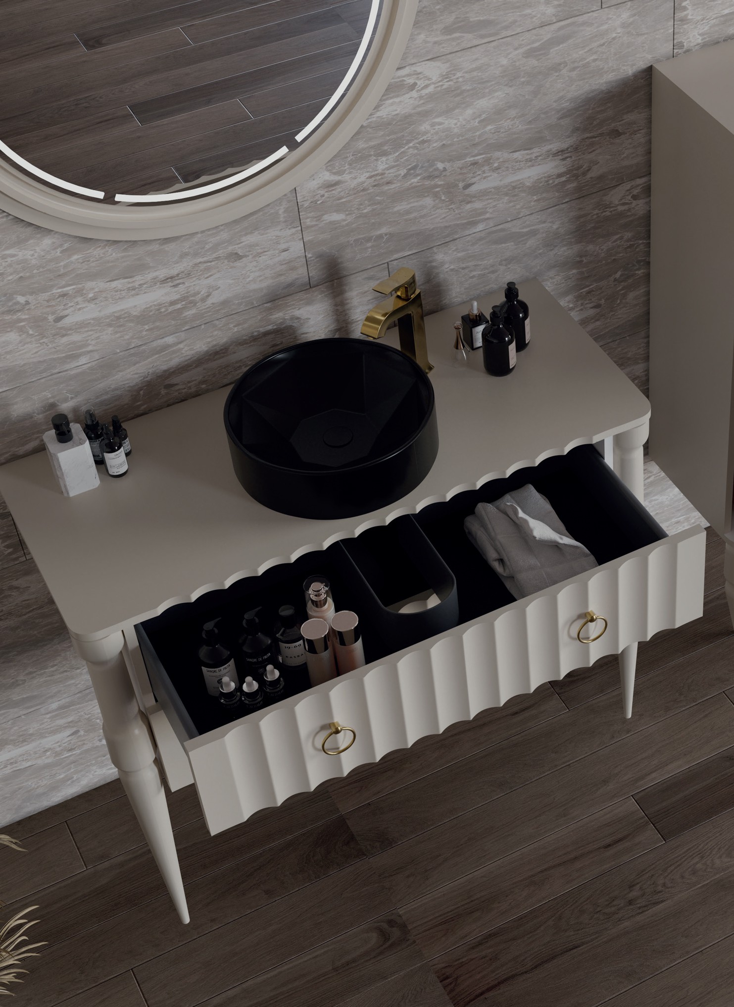 • Assembly: Doors, drawers, and accessories (hinges, handles) are installed. The cabinet is placed and fitted in the bathroom.