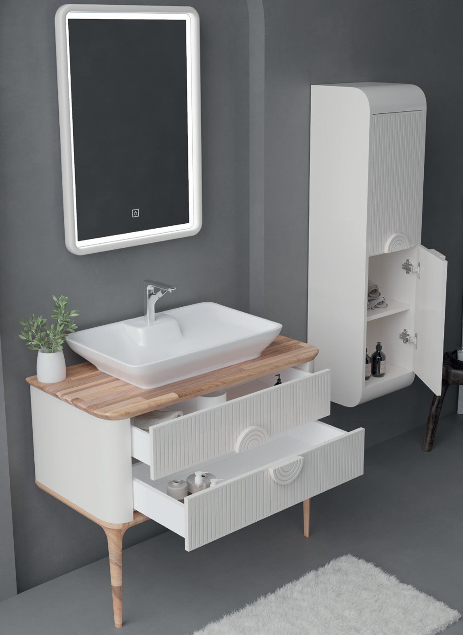 - Assembly: Doors, drawers, and accessories (hinges, handles) are installed. The cabinet is placed and fitted in the bathroom.
