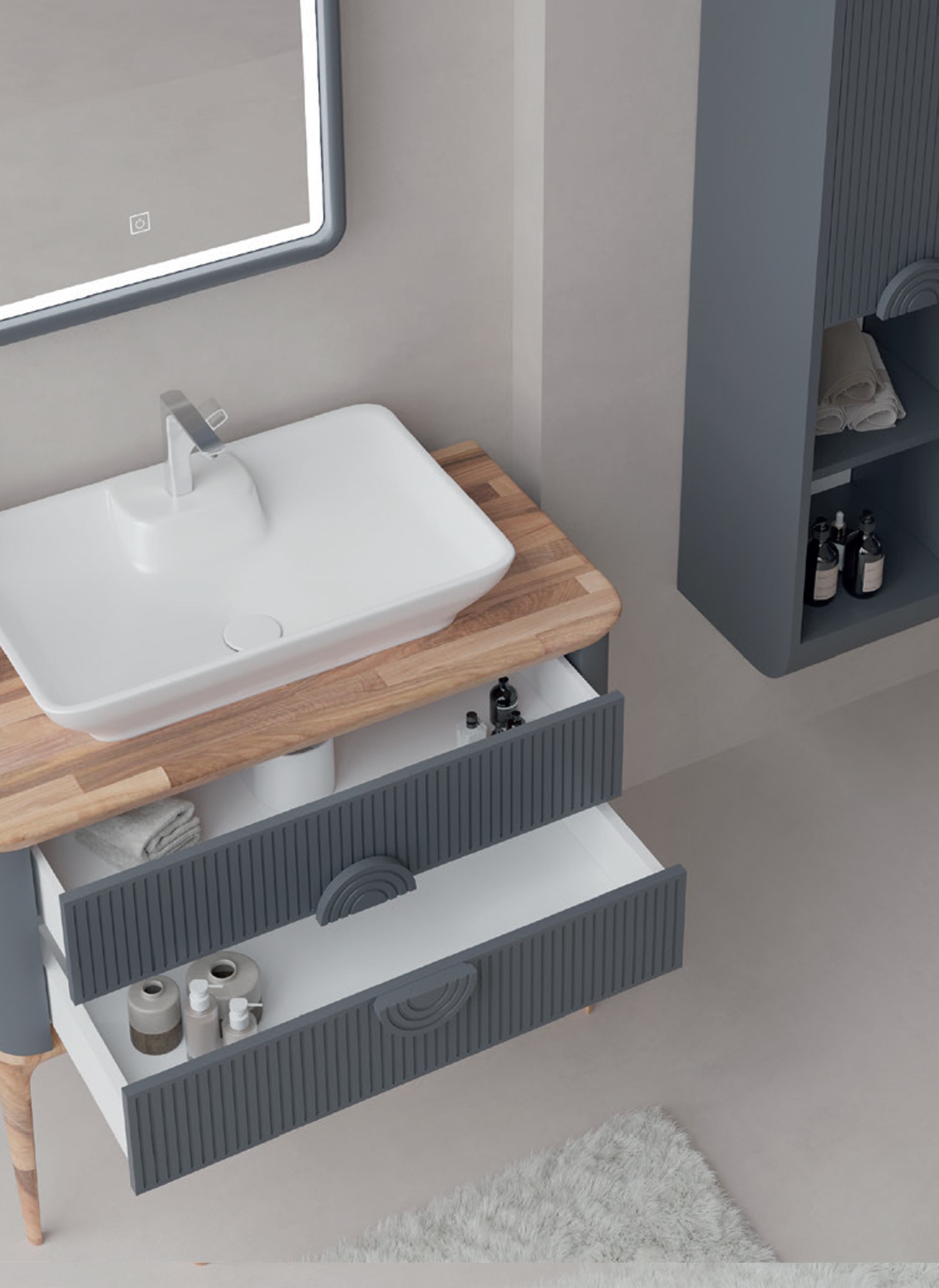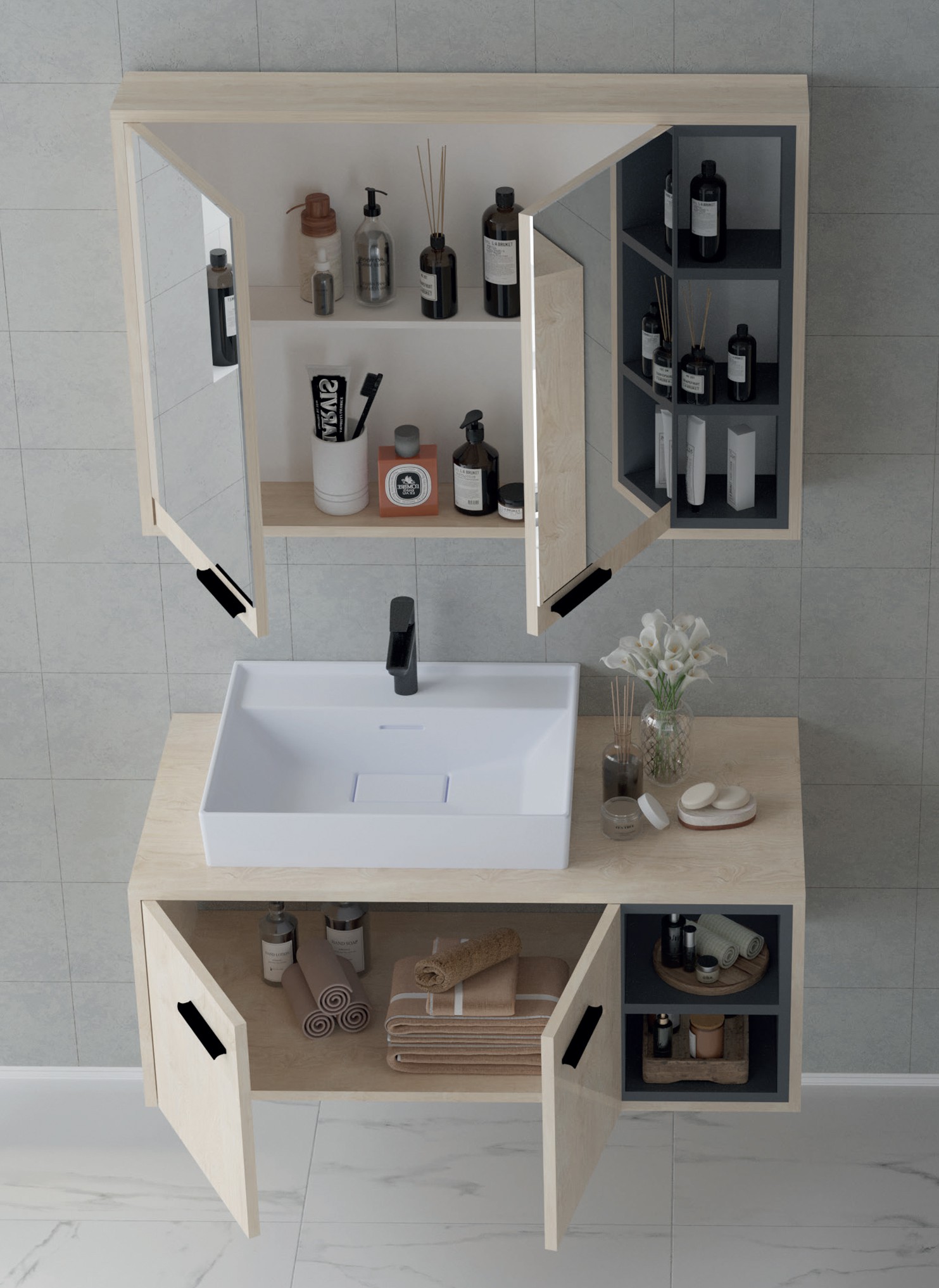 - Tasarım ve Ölçü: Banyonun ölçüleri alınır ve dolabın tasarımı (çekmeceler, raflar, kapaklar) belirlenir. 3D çizim programları veya iç mimari projelerle tasarım yapılır.