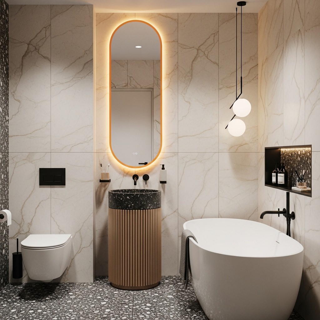 Modern Rezidanslar ve Loftlar: Penthouse dairelere prestij katmak veya açık konseptli loftlarda bölme duvara ihtiyaç duymadan şık bir banyo alanı oluşturmak için tercih edilir.